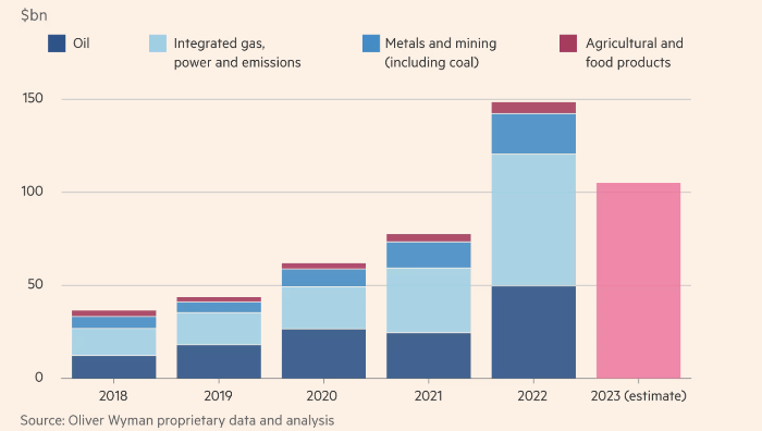 Согласно исследованию, валовая прибыль от торговли сырьевыми товарами у таких игроков, как банки, хедж-фонды, независимых трейдеров и компании, обеспеченные активами, такие как BP и Shell, выросла примерно с $36 млрд в 2018 году до рекордных $148 млрд в 2022 году во многом из-за последствий военного конфликта на Украине. В 2023 году Oliver Wyman оценивает валовую прибыль или маржу — сумму, полученную от торговых операций до вычета расходов, таких как налоги, зарплаты и бонусы, — в $105 млрд, что на 30% меньше в годовом исчислении, но все же вдвое превышает исторические уровни.