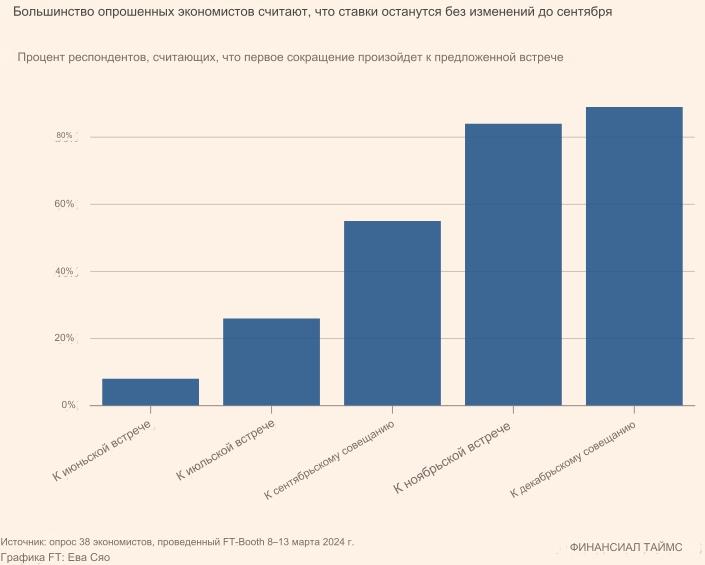 «Данные говорят, что лучшее время для снижения ставок — сентябрь, но политики говорят, что июнь», — сказал Рейнхарт, который не участвовал в опросе. «Они не хотят начинать сокращения так близко к выборам».