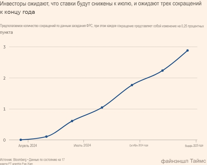 Это более позднее начало, чем ожидалось на финансовых рынках, где трейдеры прогнозируют три сокращения в этом году, причем первое снижение на четверть пункта произойдет в июне или июле. Текущий прогноз ФРС, который должен быть обновлен в среду, также предусматривает три сокращения ставки в 2024 году.