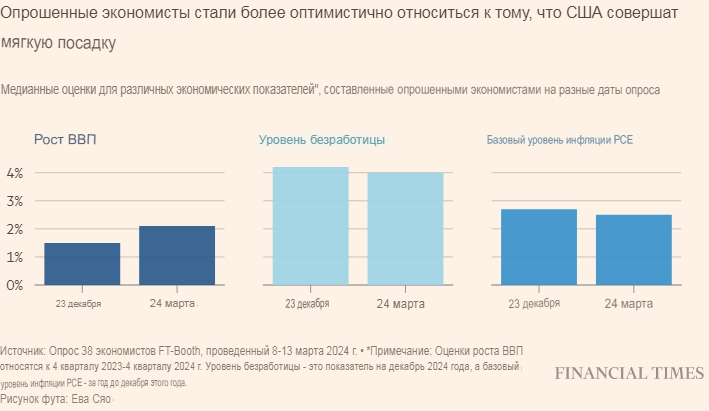 Данные по рынку труда и экономическому росту также оказались более сильными, что привело к росту уверенности респондентов в том, что экономика США достигнет мягкой посадки – когда ФРС сможет достичь своей цели по инфляции в 2 процента без резкого роста безработицы – по сравнению с декабрьским опросом. Менее половины респондентов ожидали рецессию до 2026 года.