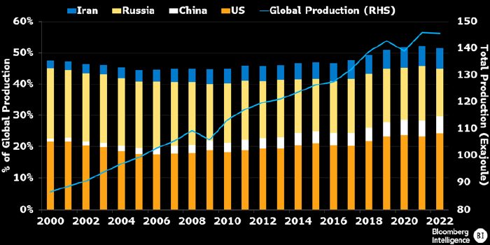 Крупнейшие производители природного газа: синим — Иран, желтым — Россия, белым — Китай, оранжевым — США, голубая линия — мировое производство в экзаджоулях (правая шкала). Левая шкала — процент мирового производства. Источник: Bloomberg