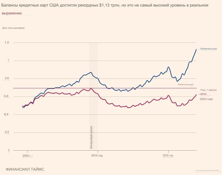 За последние три года американцы набрали миллиарды долларов долгов по кредитным картам. В своем отчете за последний квартал 2023 года ФРБ Нью-Йорка сообщила, что долг по кредитным картам достиг рекордной отметки в $1,13 трлн и растет одними из самых высоких темпов более чем за 20 лет, хотя в реальном выражении он остается ниже уровня эпохи финансового кризиса. Доходы населения за это время также выросли, что сделало более доступными большие остатки по кредитным картам.