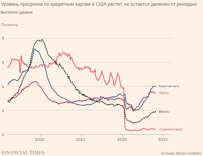Просрочки начали расти одновременно с окончанием трехлетнего моратория на погашение студенческих кредитов. По данным Moody's, просрочки по кредитным картам достигли самого высокого уровня с апреля 2011 года, обогнав просрочки по автокредитам после двух лет нахождения в их тени.