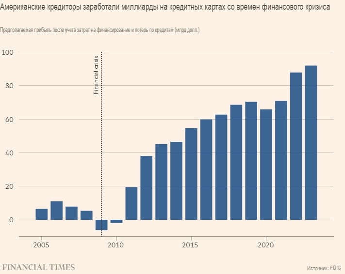 Согласно расчетам FT, основанным на данных FDIC, в прошлом году они получили примерно 92 миллиарда долларов дохода от займов по кредитным картам с учетом затрат на финансирование и потерь по кредитам — что более чем вдвое превышает предполагаемые 45 миллиардов долларов, которые они заработали десять лет назад, и намного выше чем в период до финансового кризиса.