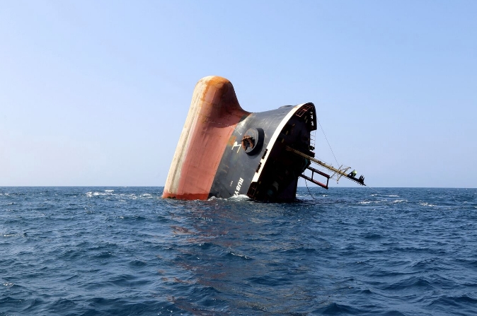 Грузовое судно Rubymar частично затоплено у берегов Йемена, 7 марта. Фотограф: Халед Зиад/AFP/Getty Images