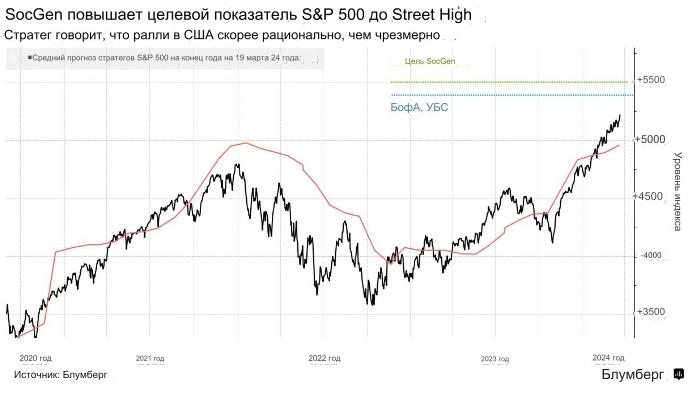 Команда под руководством Маниша Кабра повысила свой прогноз по индексу S&P 500 на конец года до 5 500 пунктов с 4 750 - это самый высокий прогноз среди стратегов, отслеживаемых Bloomberg. Новая цель предполагает рост более чем на 5% по сравнению с текущими уровнями.
