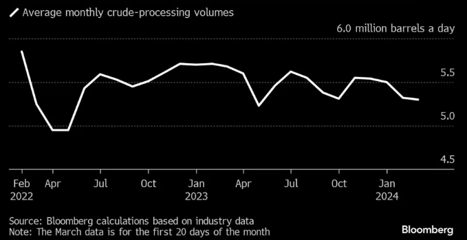 Расчеты показывают, что переработка нефти в стране с 1 по 20 марта, включая период до последних атак, составила в среднем почти 5,3 миллиона б/д, что близко к уровням, наблюдавшимся в начале февраля.