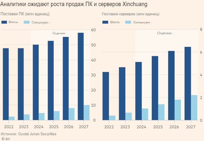 Лин Цинъюань, эксперт по чипам из исследовательской группы Bernstein, считает, что замена процессоров для серверов будет происходить быстрее, чем для ПК, поскольку экосистема программного обеспечения, нуждающегося в замене, более ограничена. Он ожидает, что в 2026 году на серверы xinchuang будет приходиться 23 процента от общего объема поставок серверов в Китае.