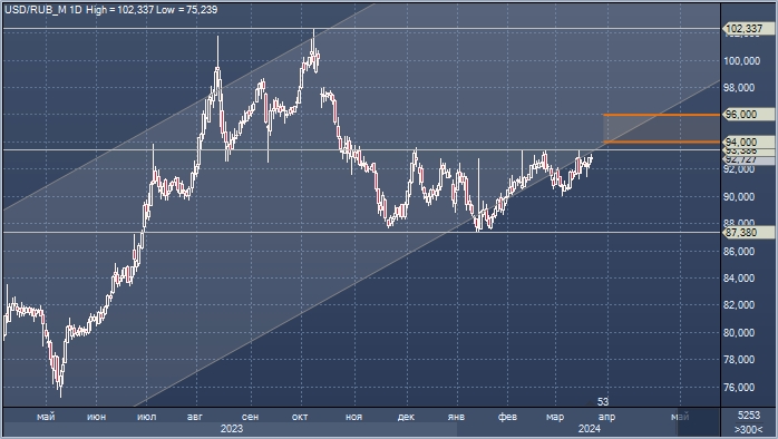 Валютная пара доллар/рубль во 2 квартале 2024 года невзирая на меры поддержки со стороны Правительства РФ и Банка России может возобновить коррекцию в направлении 94–96 рублей за единицу валюты США на фоне устойчивого импорта и сезонного ухудшения экспортных поступлений, считают аналитики Росбанка. С учетом текущих значений курса, ослабление российской валюты до 96 за доллар означает потенциал роста доллара к рублю на 3,6%.