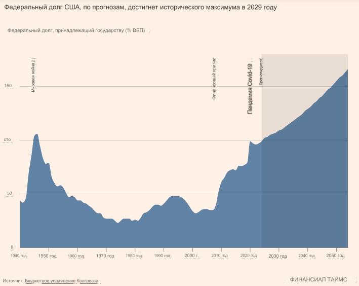 Он резко вырос после радикального снижения налогов Дональдом Трампом в 2017 году и огромных расходов на стимулирование экономики во время пандемии. Трамп пообещал возобновить действие программы снижения налогов, срок действия которой истекает в следующем году, если он победит Джо Байдена на президентских выборах в этом году.
