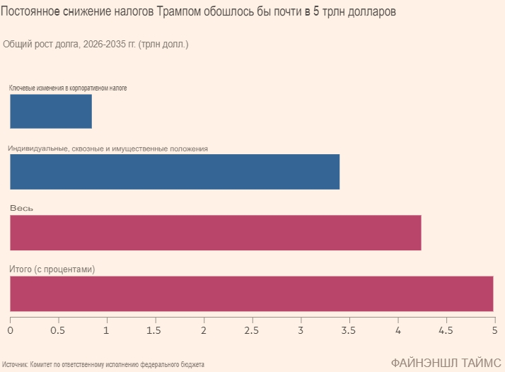 Комитет по ответственному федеральному бюджету, аналитический центр, заявил, что, если Трамп возобновит программу снижения налогов, это добавит еще 5 триллионов долларов к федеральному долгу в период с 2026 по 2035 год.
