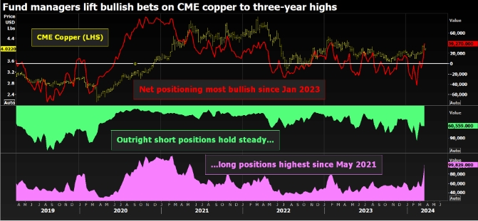 Согласно последнему отчету об обязательствах трейдеров (COTR), длинные позиции управляющих фондами в контрактах на медь на CME подскочили на 43% до 99 829 контрактов за неделю до 18 марта.