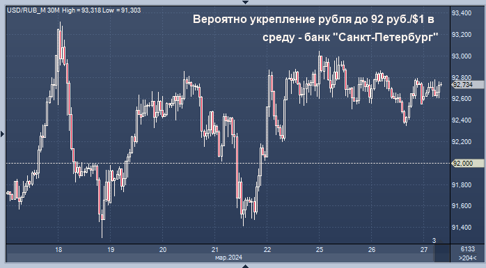 "Учитывая, что в четверг налоговые выплаты, экспортеры могут увеличить продажи валют в среду. Жду новых попыток доллара откатиться в нижнюю часть нашего целевого диапазона 91,5-93 руб./$1. Полагаю, что этот диапазон сохранит свою актуальность до конца недели, прочность зоны 93-93,5 руб./$1 курс доллара скорее будет проверять уже в апреле", - пишет представитель Промсвязьбанка Евгений Локтюхов.