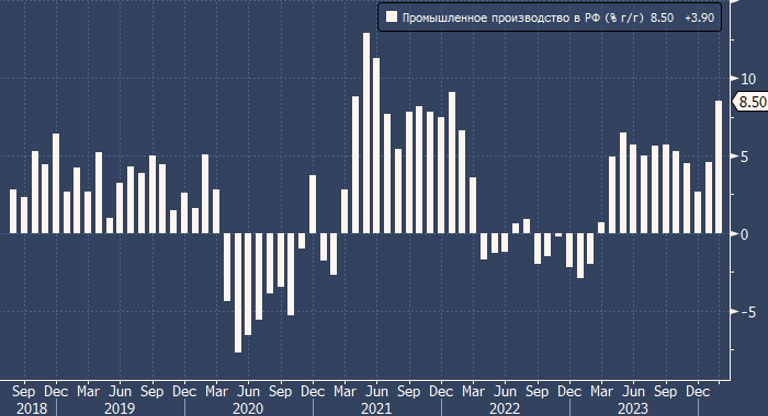 Необычайно высокий рост промышленного производства в РФ в феврале (+8,5% г/г против консенсус-прогноза +5,3% г/г — прим. ProFinance.ru) был обусловлен расходами в оборонной отрасли, а также эффектом високосного года, который увеличил продолжительность месяца на один день. Однако даже с учетом сезонности и с поправкой на число рабочих дней данный показатель все равно вырос на 1% м/м.