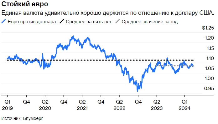 Несмотря на более низкие процентные ставки в еврозоне и заметно более слабую экономику, чем в США, евро держится на удивление хорошо по отношению к доллару. Самая популярная валютная пара на валютном рынке торгуется не только на уровне среднего значения за последний год - $1,085, но и в пределах досягаемости среднего пятилетнего значения - $1,11. Однако единая валюта не может вечно бросать вызов гравитации, поэтому возвращение к паритету с долларом выглядит более вероятным, чем нет, в течение этого года.