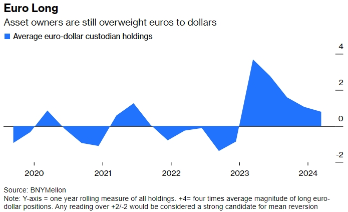 Длинные евро. Владельцы активов по-прежнему имеют повышенный вес в евро по отношению к доллару. Источник: BNYMellon