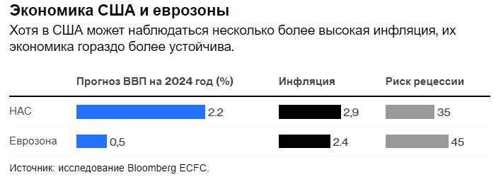 Экономика США и еврозоны. Хотя в США инфляция несколько выше, их экономика гораздо более устойчива. Источник: Обзор Bloomberg ECFC