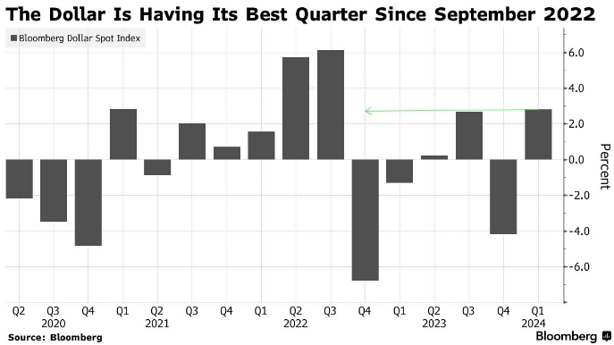 В последние дни марта произойдет много событий, которые могут продлить рост доллара на 3% по отношению к основным аналогам за последние три месяца. Такой подъем стал бы самым сильным укреплением с третьего квартала 2022 года. Предпочтительный показатель инфляции ФРС должен быть представлен в пятницу, наряду с выступлением Джерома Пауэлла.