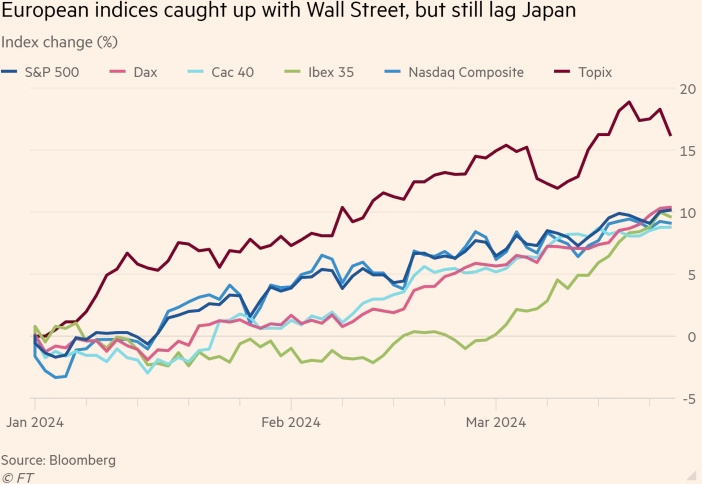 Британский индекс FTSE 100, немецкий Dax, французский CAC 40 и испанский Ibex 35 в марте превзошли индекс S&P 500, поскольку бешеные темпы ралли на Уолл-стрит начали снижаться, а глобальные индексы - и сектора, не связанные с технологиями, - догнали более ранние достижения США, вызванные ажиотажем вокруг предстоящего повсеместного внедрения в жизнь общества искусственного интеллекта.