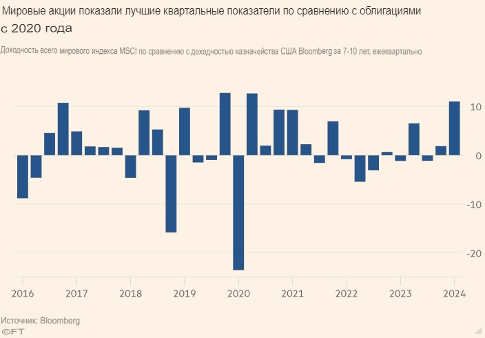 Индекс мировых акций MSCI вырос на 7,7 процента в этом году, что является максимальным приростом с 2019 года, при этом акции опережают облигации с наибольшим отрывом за любой квартал с 2020 года, даже несмотря на то, что трейдеры ослабили свои ожидания относительно быстрого снижения процентных ставок.