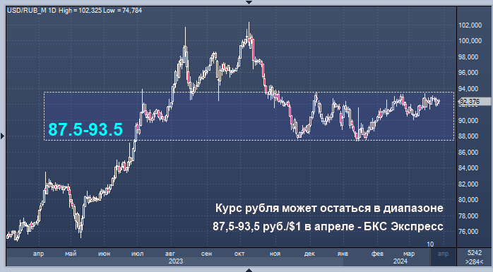 Курс рубля по отношению к доллару США может остаться в боковом диапазоне 87,5-93,5 руб./$1 в апреле, говорится в комментарии эксперта БКС Экспресс Михаила Зельцера.