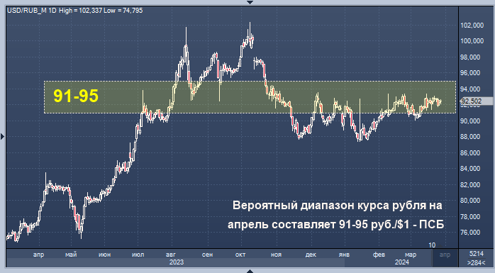 Ключевым событием для валютного рынка станет решение правительства РФ по продлению норм об обязательной продаже валютной выручки крупнейшими экспортерами, одного из важных факторов сохранения стабильности рынка. Мы ждем положительного решения, целевым на апрель по курсу доллара в настоящее время видим диапазон 91-95 руб./$1", - сообщает начальник отдела экономического и отраслевого анализа Промсвязьбанка Евгений Локтюхов.