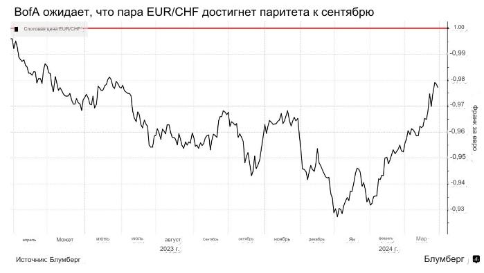 До решения ШНБ BofA прогнозировал паритет франка в последнем квартале следующего года. Теперь стратеги считают, что он достигнет отметки 1,10 к концу 2025 года.