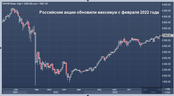 Индекс МосБиржи достиг 3360 пунктов и обновил максимум с февраля 2022 года на фоне широкого подъема большинства бумаг. Лидируют расписки Х5 на новостях, а также бумаги золотодобывающих компаний во главе с ПАО "Полюс" на фоне рекордных цен на желтый металл. Расписки X5 Retail выросли на 7,5%, до 3166 рублей.