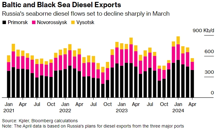 План экспорта дизельного топлива на апрель, с которым ознакомился Bloomberg, показывает только потоки, доставляемые в три ключевых внутренних порта по трубопроводу. Сюда не включены меньшие объемы, направляемые на экспортные рынки по железной дороге и за пределы системы нефтепродуктопроводов ПАО «Транснефть». Фактические потоки могут отличаться в зависимости от погоды и спроса со стороны иностранных заказчиков.
