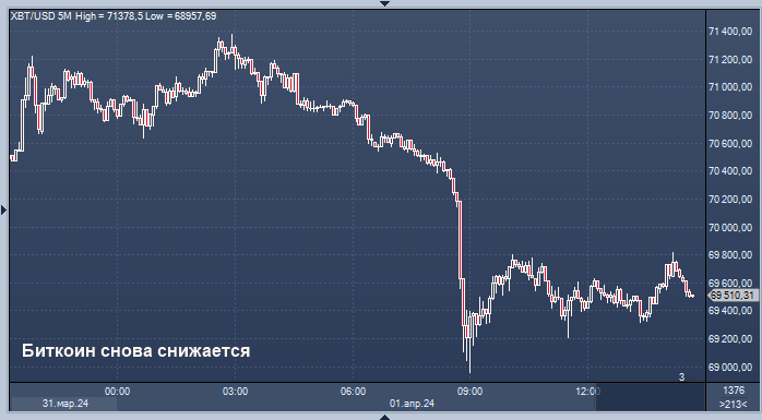 Цена биткоина упала на 1% за последние 24 часа до примерно 69 500 долларов США, быстро опустившись с уровня выше 71 000 долларов США до минимума ниже 68 000 долларов США за считанные часы. Крупнейший цифровой актив продолжает удерживаться в области психологически важного уровня в 70 000 долларов и значительно ниже своего исторического максимума около 74 000 долларов, достигнутого в середине марта.