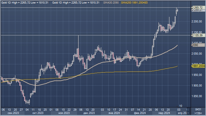 В понедельник цена на золото достигла рекордных 2265,7 доллара за унцию, после чего во вторник днем немного снизилась до 2251,53 доллара за унцию после того, как позитивные производственные данные в США (индекс ISM в марте 50,3 п. против прогноза 48,3 п.) побудили трейдеров несколько сократить ожидания того, что ФРС начнет снижать ставки в июне.