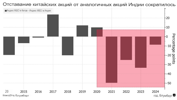 Наметившееся колебание показывает, что фонды начинают верить в то, что политической поддержки Китая будет достаточно для оживления экономического роста. Хотя крупные банки Уолл-стрит продолжают позиционировать Индию как ключевое направление инвестиций в следующем десятилетии, инвесторы становятся осторожными на фоне завышенных оценок и предупреждений регуляторов о "пузыре" на рынке.