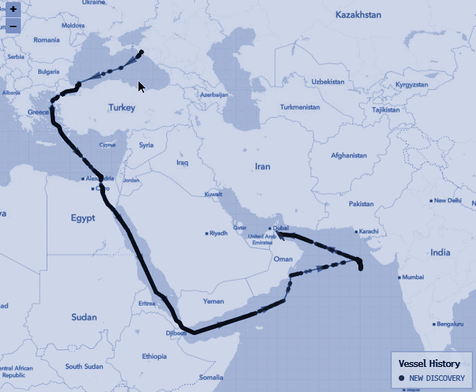 В конце марта танкер Suezmax Кэролайн Безенги забрала груз с судна New Discovery. В настоящее время груз находится на пути в индийский Вишакхапатнам и ожидается, что он прибудет 6 апреля.