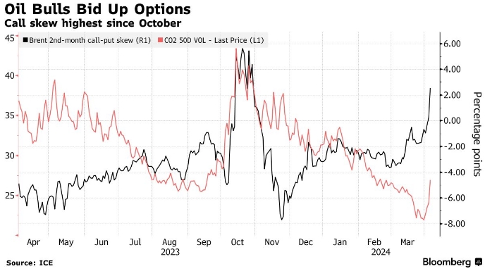 В течение последнего месяца трейдеры делали "бычьи" опционные ставки на то, что нефть марки Brent достигнет 95 долларов за баррель, поскольку конфликт между Израилем и ХАМАС распространился по всему Ближнему Востоку, а сокращения ОПЕК+ ужесточили ситуацию на рынке. Сейчас стоимость этих контрактов выросла более чем в два раза, поскольку фьючерсы приближаются к этому уровню.