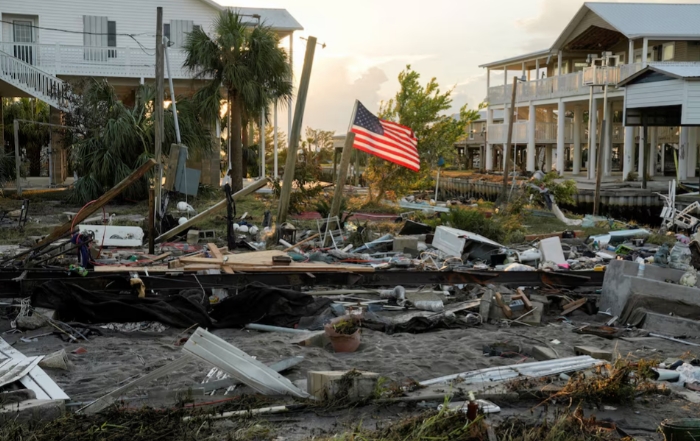 Американский флаг виден среди обломков дома Дарлин Пауэлл после прихода урагана "Идалия" в Хорсшу-Бич, Флорида, США, 31 августа 2023 года. REUTERS/Cheney Orr