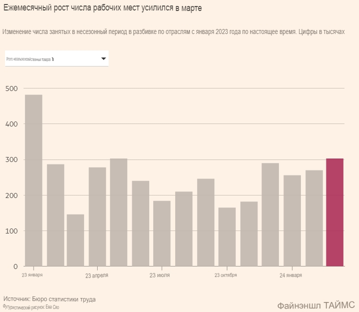 Американские работодатели создали 303 000 рабочих мест в марте, что значительно превзошло ожидания, и стало признаком того, что рынок труда остается оживленным, несмотря на высокие процентные ставки.
