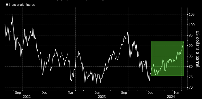 Несколько дней назад цены на нефть превысили $90 за баррель. Предположительно, очередной восходящий виток спровоцировало обострение конфликта между Израилем и Ираном. Однако фундаментально причины роста цен связаны с глобальными перебоями в поставках, при этом удорожание сырьевых товаров может спровоцировать разгон инфляции.