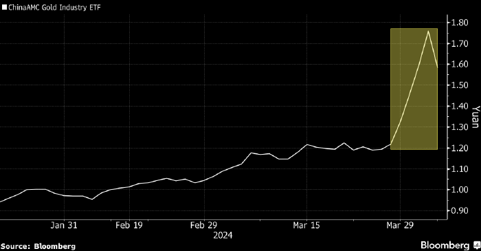 В понедельник, 8 апреля, были остановлены торги паями биржевого фонда (ETF) ChinaAMC CSI SH-SZ-HK Gold Industry Equity ETF, инвестирующего в акции китайских золотодобывающих компаний. Компания, управляющая данным фондом — China Asset Management Co. — сообщила, что остановка торгов потребовалась для защиты интересов инвесторов, т. к. цена паев данного ETF превысила стоимость его активов на 30% с лишним.