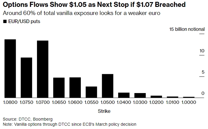 Анализ опционов показывают $1,05 в качестве следующей остановки при прорыве $1,07. Около 60% от общего объема ванильных опционов ориентированы на ослабление евро. Источник: DTCC, Boomberg. Примечание: Ванильные опционы через DTCC после мартовского решения ЕЦБ.