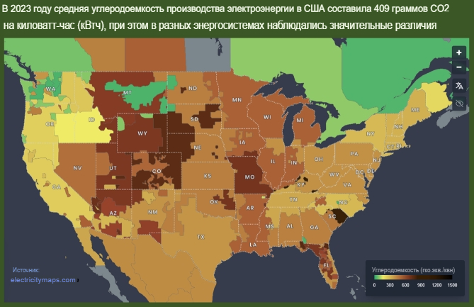 Средняя углеродоемкость производства электроэнергии в США в 2023 году составит 409 граммов CO2 на киловатт-час (КВт-ч), при этом в разных энергосистемах будут наблюдаться значительные различия.