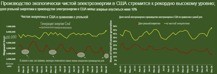 Согласно данным, собранным LSEG, в течение первых трех месяцев 2024 года доля угля в общем объеме производства электроэнергии в США составляла около 16 %, что ниже 17 % за тот же период год назад и 24,3 % в первом квартале 2021 года.