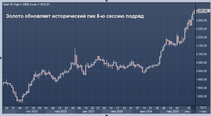 Спотовое золото подорожало на 1,1% до $2 363,42 за унцию к 09:36 GMT после достижения рекордного максимума $2 365,09.