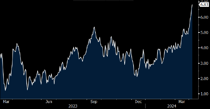 Сила рынка находит отражение в усилении бэквордации (расширении календарных спредов): в частности, 12-месячный спред (декабрь 2024 — декабрь 2025) в нефти Brent достиг многомесячных максимумов чуть ниже $7 за баррель (см. график ниже).