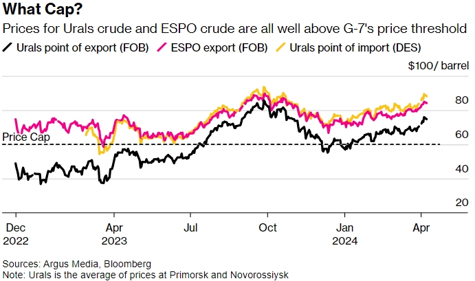 Российская нефть торгуется со значительным превышением предельного уровня цен, установленного Группой семи, который должен лишить Москву доходов для финансирования СВО на Украине, что свидетельствует о значительном несоблюдении этой меры.