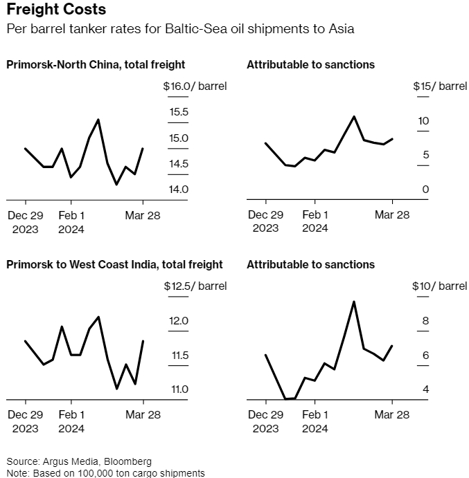 Когда речь идет о транспортировке грузов Urals с Балтики в Индию или Китай, по оценкам агентства ценовой отчетности, санкции увеличивают стоимость доставки на 7,12 и 8,79 доллара за баррель соответственно. Оба показателя хотя и высоки, но ниже, чем месяц назад.