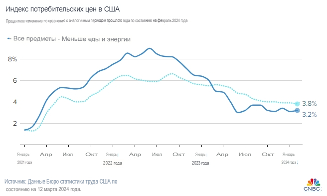 Энергетика выросла на 1,1% после роста на 2,3% в феврале, в то время как расходы на жилье, которые составляют около трети веса в ИПЦ, выросли на 0,4% по сравнению с предыдущим месяцем и на 5,7% по сравнению с годом ранее. Ожидания замедления расходов на жилье в течение года были центральными в тезисе ФРС о том, что инфляция достаточно остынет, чтобы позволить снизить процентные ставки.