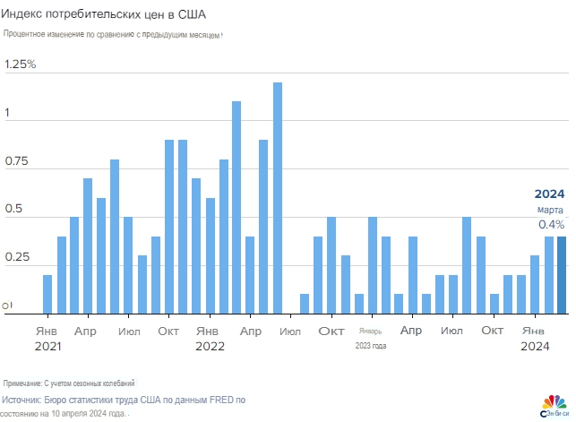 Бюро трудовой статистики также сообщило в среду, что базовая инфляция, которая исключает изменения стоимости продуктов питания и энергоносителей, осталась на уровне 3,8 процента. Экономисты ожидали, что базовый уровень инфляции в марте составит 3,7 процента.