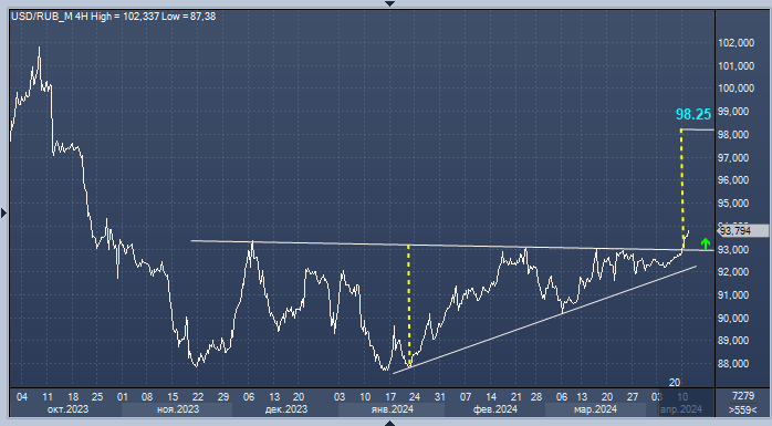 Собственно говоря, ничего нового, лишь повторение вчерашнего тезиса о том, что старый тренд скорее продолжится, чем изменится, а речь идет об аптренде на месячном/квартальном графике по доллар/рублю, а также о том правиле, что, чем дольше консолидация, тем сильнее выстрел. Волатильность не может быть подавленной всегда, всплески сменются периодами стагнации. Сейчас возможен такой всплеск, потому что мы выходим из консалидационного треугольника.