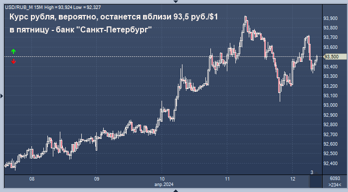 Курс пары доллар/рубль, вероятно, останется вблизи 93,5 руб./$1 на торгах в пятницу в преддверии выходных, а дальнейшую динамику могут задать новости относительно продления мер валютного контроля, говорится в комментарии аналитиков банка "Санкт-Петербург".