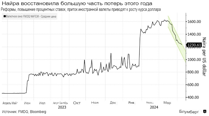 Экономисты Goldman, которые в феврале прогнозировали, что найра укрепится до 1 200 за доллар в 2024 году, теперь считают, что после ряда мер, принятых центральным банком, она может подняться выше этого уровня.